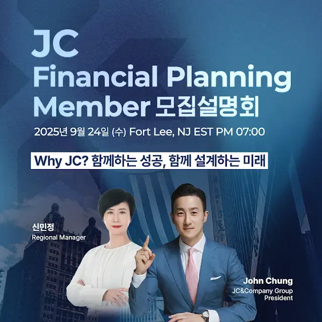 미국 법무·회계법인 JC&Company Group이 뉴저지 Fort Lee에서 JC Financial Planning Member 모집설명회를 개최합니다.